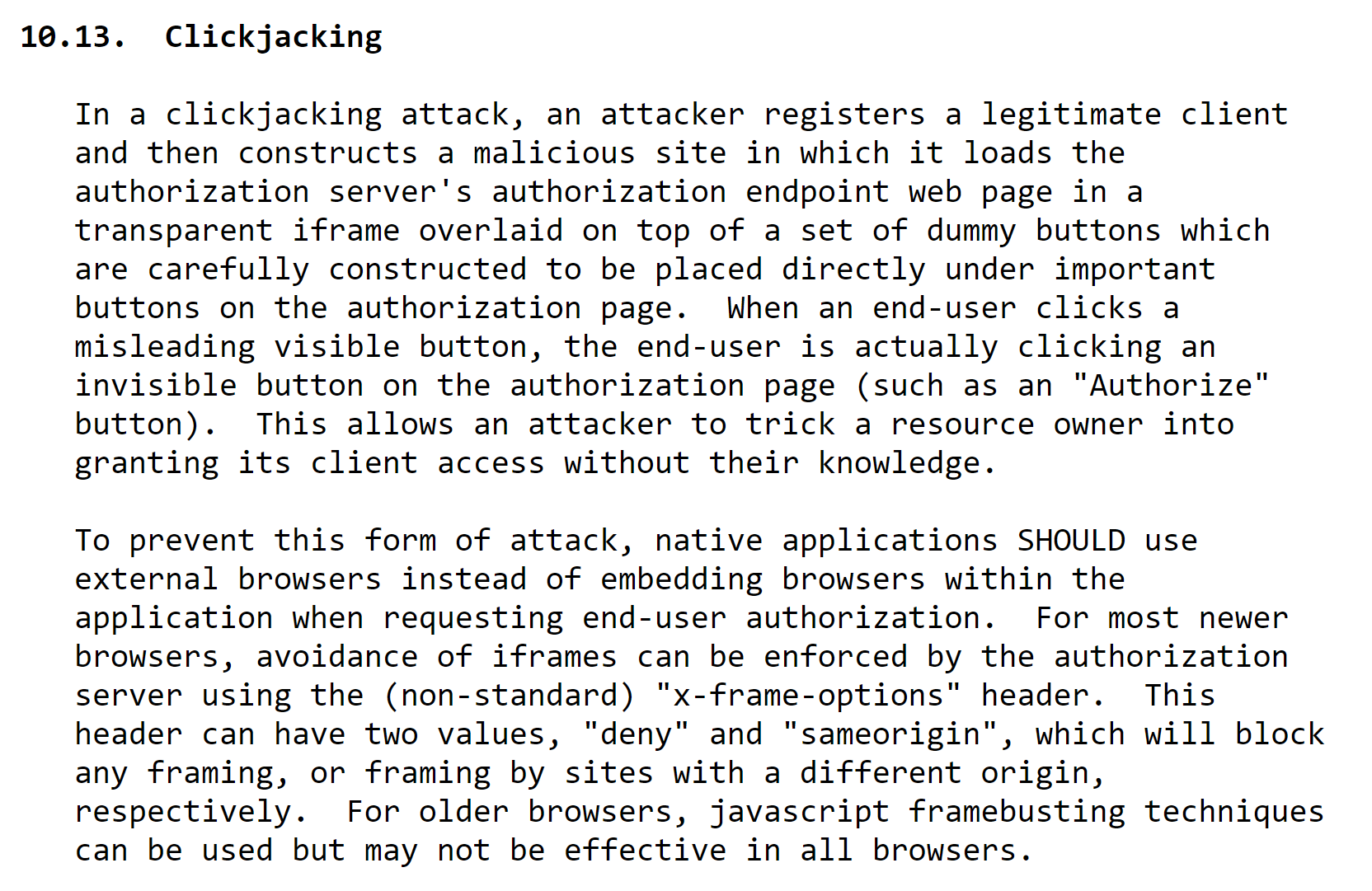 这种方式在理论上也是可行的,但是可能导致安全问题,因为iframe有“点击劫持”(Clickjacking)的安全问题。所以OAuth2是禁止使用iframe的。